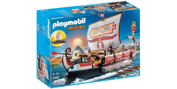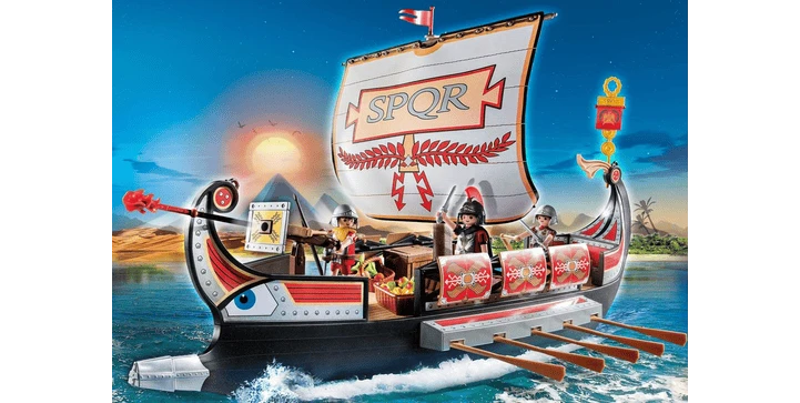 1, 2, 1, 2 – kraftvoll durchpflügen die Ruder der Römischen Galeere das Meer. „Land in Sicht! Bringt das Feuergeschütz in Stellung!“ ruft der Tribun. „Sobald wir in Schussreichweite sind gebe ich das Signal“. Die Galeere ist schwimmfähig und kann mit einem Unterwassermotor (7350 – separat erhältlich) aufgerüstet werden. Zum Spielen im Kinderzimmer ist der Schiffsrumpf mit Rollen ausgestattet. Für einen sicheren Stand der Figuren an Deck sorgen sechs Fußklemmungen.