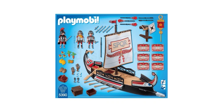 - Zubehör: 1 Galeere, 2 Karotten, 3 Äpfel, 1 Paar Ananas, 1 Bananenstaude, 1 Set Mischbrot, 1 Picknickkorb, 1 Kiste, 1 Bäckerkorb, 2 Pokale, 2 Weingläser, 1 Feldzeichen, 5 Kurzschwerter, 3 Feuergeschosse, 6 Schilder, 1 Kanone, 2 Dolche, 2 Kolbengeschosse, 1 grüner Steckzapfen, 1 Pilum, 2 Amphoren