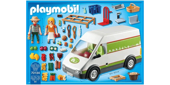 - Zubehör: 1 Hofladen-Fahrzeug, 2 Verkaufsstände, 6 Gemüsesteigen, 1 Kartoffelkorb, 1 Korb, 1 Waage, 1 Getränkekasten, 2 Flaschen, 1 Hängeregal, 5 Tabletts, 1 Sackkarre, 2 Geldbörsen, 1 Safttüte, 2 Milchtüte, 1 Brot, 2 Marmeladengläser, 1 Honig, 2 Eierschachteln, 1 Set Käse, 1 Set Birnen, 1 Set Bananen, 1 Set Brötchen, 1 Set Grünkohl, 1 Set Rotkohl, 1 Set Blumenkohl, 1 Set Tomaten, 1 Set Paprika, 1 Set Gurken, 1 Set Möhren, 3 Äpfel, 1 Knoblauch, 2 Wurstketten