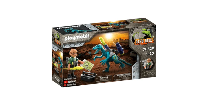 Deinonychus mit abnehmbarer Rüstung und schwenkbarer Doppelkanone. Uncle Rob mit Werkzeug, Werkzeugkasten und Werkzeuggürtel.