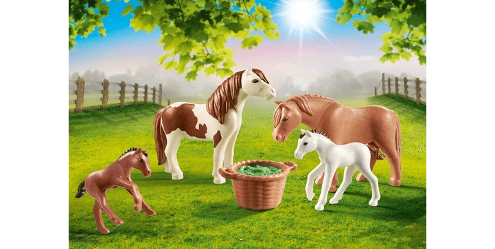 Die Ponymamas stärken sich mit ihren Fohlen am Futterkorb.