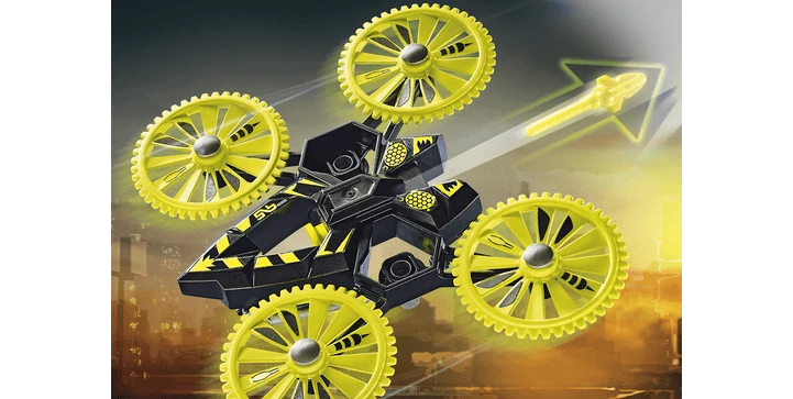- Zubehör:1 Polizei-Jet, 1 Drohne, 1 Helm, 1 Armcomputer, 1 Headset, 1 Minicomputer, 1 Geldsack, 4 Geschosse, 1 GPS