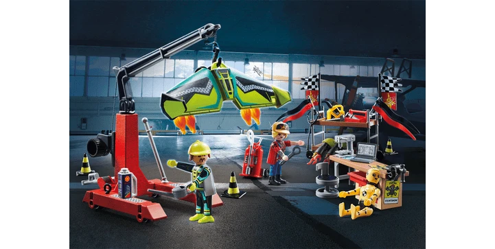 In der Servicestation werden die Flugobjekte und deren Einzelteile gewartet und repariert. Incl. mobilen Kran mit Seilwinde und Wingsuit.