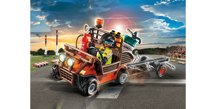 - Zubehör: 1 Reparaturservice-Fahrzeug mit Rundumleuchte, 1 Schubstange mit Räder, 1 Benzinfass mit Pumpe, 2 Bremsklötze, 1 Megaphon, 1 Werkzeugkiste, 6 Werkzeuge, 1 Feuerlöscher, 3 Verbindungselemente, 1 Kopfbedeckung mit Kopfhörer, 1 Paar Handschuhe