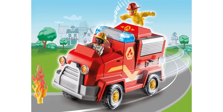 Achtung! In Playmoville ist ein Brand ausgebrochen. Wo bleibt denn nur Freddy Fire mit seinem Feuerwehr Einsatzfahrzeug? Da ist er schon und bringt den Brand mit der Wasserkanone und Ducklas‘ Hilfe schnell unter Kontrolle. Das Spielset besteht aus zwei PLAYMOBIL-Figuren und einem Feuerwehrauto mit innovativer Kipp-Lenkung inklusive Hubkorb mit Wasserkanone plus Wasserpfeilen sowie zusätzlichen Staufächern für Equipment.