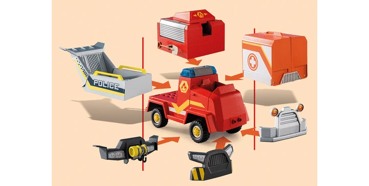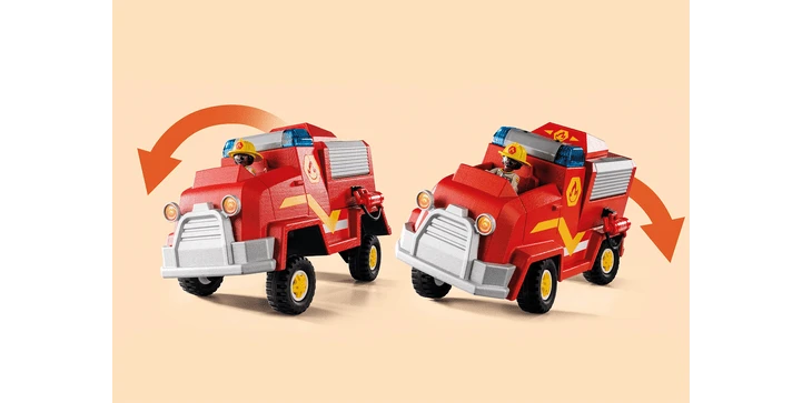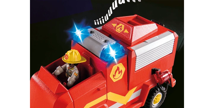 - Zubehör: 1 Feuerwehr-Auto mit Kipplenkung und Licht- und Soundmodul sowie dreh- und höhenverstellbarem Container inklusive Löschkanone und 2 Klappen, 1 Flamme, 2 Wasserpfeile, 1 Leiter, 1 Feuerlöscher, 1 Spaten