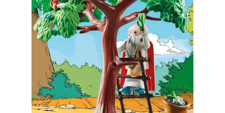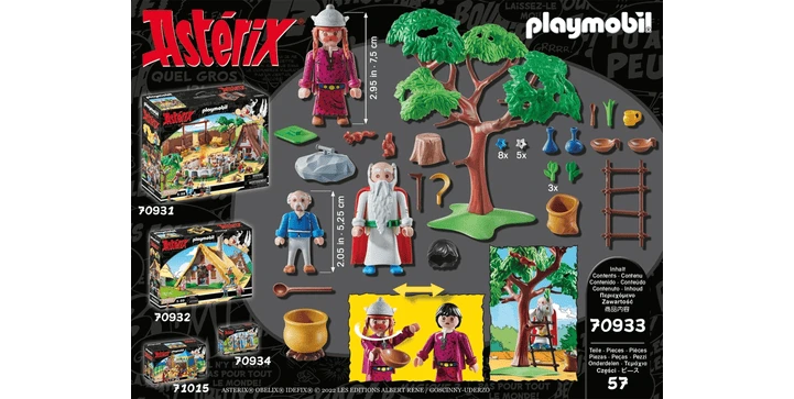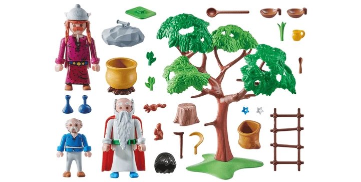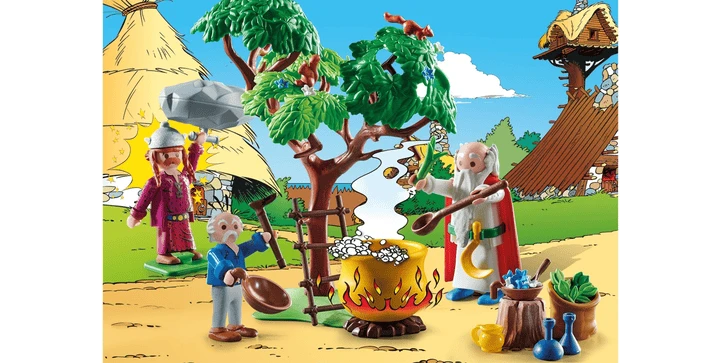 Mit Zaubertrank-Kessel und vielen magischen Pflanzen und Kräutern. Dabei sind auch Methusalix sowie der römische Spion Caligula Minus mit einem tragbaren, großen Stein.