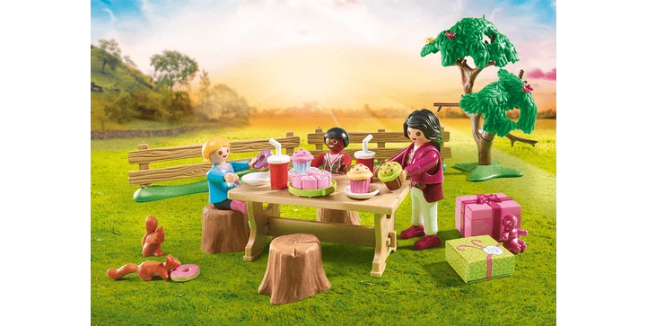 - Tiere: 2 Ponys, 2 Eichhörnchen, 3 Zaunelemente, 1 Tisch, 3 Baumstumpfstühle, 2 Geschenke, 1 Baum, 1 Schmückelement, 3 Luftballons, 3 Getränke, 1 Kuchen, 1 Karaffe, 1 Korb, 3 Cupcakes, 2 Donuts, 2 Kinderhelme,