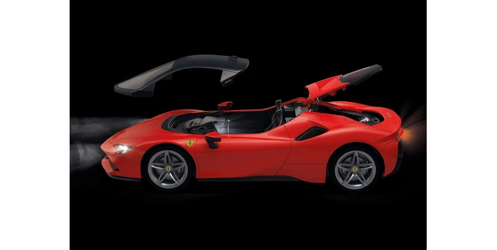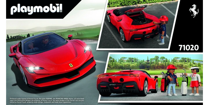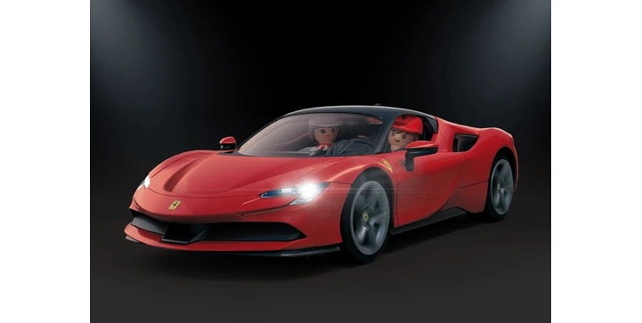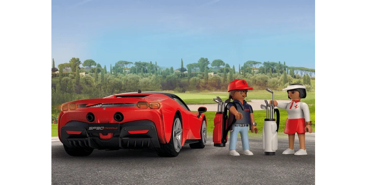 Das Set enthält einen Ferrari SF90 Stradale mit Beleuchtung von PLAYMOBIL, zwei PLAYMOBIL-Figuren, zwei Golftaschen, einen Koffer und weitere tolle Extras. Eine grandiose Nachbildung des italienischen Serienproduktion-Supercars, ideal für alle Autoliebhaber zum Ausstellen, Bewundern oder Spielen.