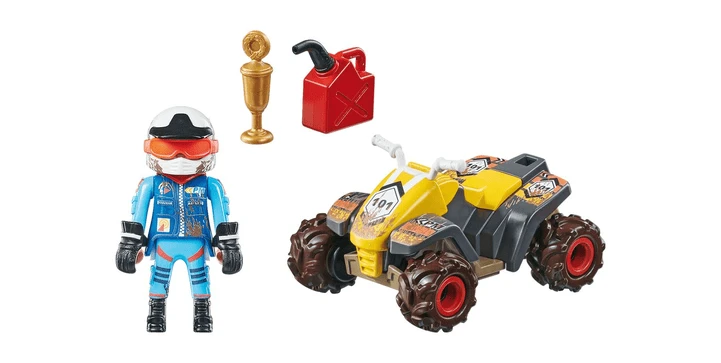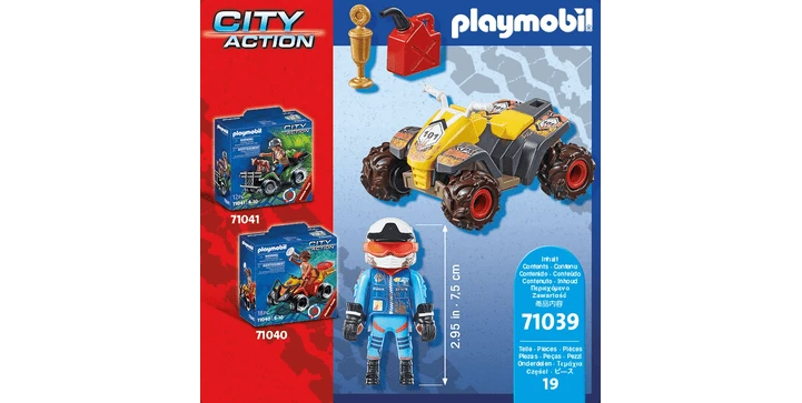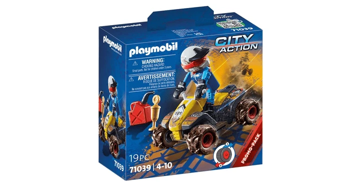 Das 19-teilige Spielfigurenset enthält eine PLAYMOBIL-Figur, ein Quad mit Rückzugsmotor, Pokal, Helm und Benzinkanister. Handschuhaufsätze und Helm mit Schutzbrille sind abnehmbar. Dieses Set kann einzeln bespielt oder mit den anderen Spielsets der PLAYMOBIL City Action Reihe kombiniert werden.