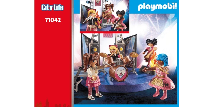 Spot ein, Musik an! Lebe dein musikalisches Talent aus mit der PLAYMOBIL-Music Band. Ob an der Gitarre, am Schlagzeug oder beim Gesang, mit dem detailreichen Music Band-Spielset von PLAYMOBIL triffst du immer den richtigen Ton. Lass die vier Musikerinnen in ihren verrückt-bunten Bühnenoutfits die Bühne rocken und bringe das Publikum zum Kochen. Schwinge gemeinsam mit der Schlagzeugerin die Drumsticks und sorge für einen rockigen Beat oder improvisiere tolle Gitarreneinlagen mit den beiden Gitarristinnen. Ein cooles Spielset für kleine und große Rockmusikfans ab 4 Jahren. Das Spielfigurenset in limitierter Auflage enthält vier PLAYMOBIL-Figuren, eine Bühne mit zwei seitlichen Podesten, zwei Gitarren, ein Schlagzeug, Mikrofon und weitere tolle Extras für musikalische Spielerlebnisse im Kinderzimmer. Die Figuren können die Gitarren mit einem Silikongurt umhängen. Teile die kreative Freude: Schlüpfe selbst in verschiedene Rollen oder spiele gemeinsam mit Freunden dein Lieblingskonzert nach.