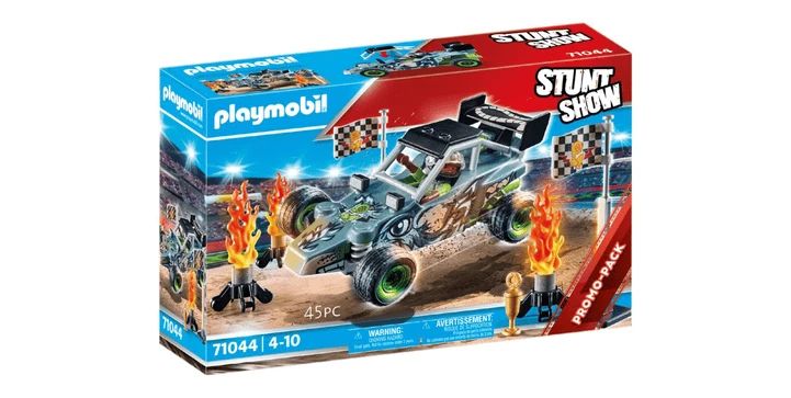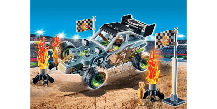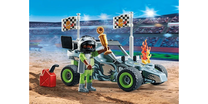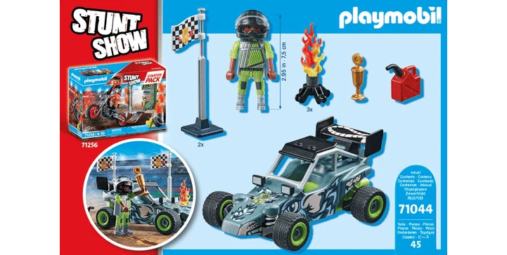 - Zubehör: 1 Stuntcar, 1 Helm, 1 Benzinkanister, 1 Pokal, 2 Siegerfahnen, 3 Feuer