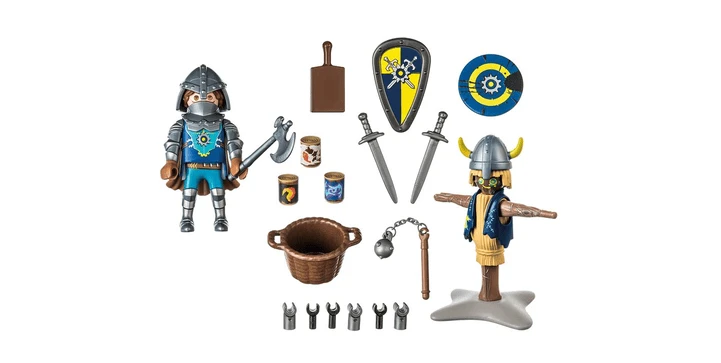 Das 24-teilige Ritter-Spielzeug besteht aus einer PLAYMOBIL-Figur, zwei Schilden, zwei Schwertern, einer Stechpuppe, einem Morgenstern und weiteren tollen Extras. Die enthaltenen Helme können sowohl der Übungspuppe als auch dem Ritter aufgesetzt werden. Dieses Set kann einzeln bespielt oder mit den anderen Ritter-Spielzeugen der Novelmore-Spielwelt kombiniert werden.