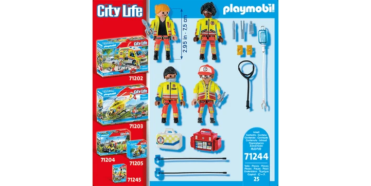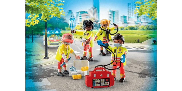 Schließe dich dem PLAYMOBIL-Rettungsteam an und werde zum Helden des Alltags. Das vierköpfige Team ist nicht nur bestens ausgebildet, sondern auch ideal gerüstet für alle Notfälle. Im Falle eines Herzinfarktes haben die Sanitäterinnen und Sanitäter ihre moderne Defibrillatortasche dabei. Mit dem Defibriallator kann Patienten schnell geholfen werden. Defibrillatortasche und Arztkoffer bieten Platz für weiteres medizinisches Zubehör wie Schere, Pinzette und Verbandsschienen. Die Schienenverbände aus Silikon passen sich flexibel an. Ran ans Stethoskop und auf in den Einsatz!