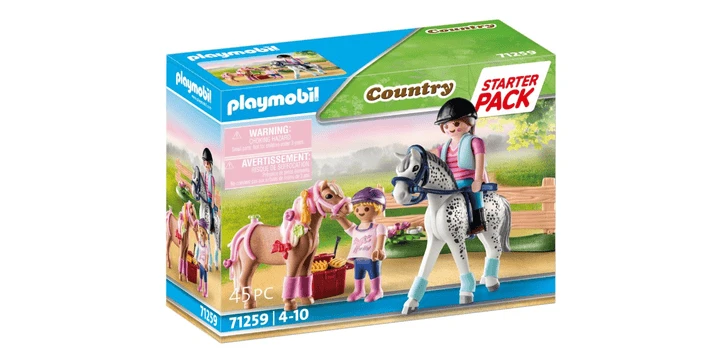 Pferdefans werden vom PLAYMOBIL Starter Pack Pferdepflege begeistert sein. Das liebevoll gestaltete Spielzeugset enthält alles was Pferdefreunde brauchen, um ihr Pony hübsch aussehen zu lassen. Neben Schleifen und Bändern können Mähne und Schweif auch mit Blüten und Herzen verschönert werden. Im Anschluss machen die beiden Reiterinnen natürlich auch einen Ausflug mit ihren Lieblingen. Ein farbenfrohes Set für tierliebe Kinder ab 4 Jahren.