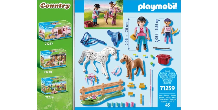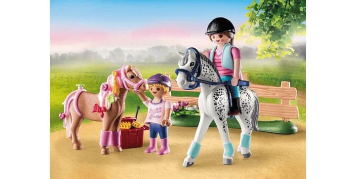 Produktdetails: Das 45-teilige Pferdespielzeug enthält zwei PLAYMOBIL-Figuren, ein Pony, ein Pferd, Bandagen, Gerte, Halfter, Zaumzeug und weitere Extras für die Pferdepflege. Die Kopfbedeckungen der Figuren sind abnehmbar.