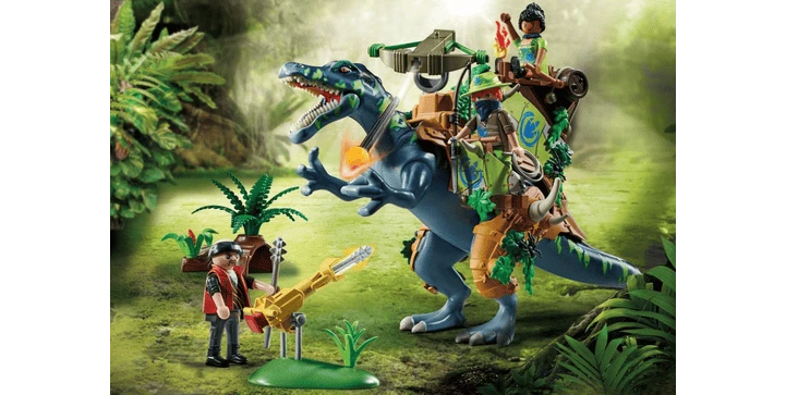 Auf geht’s in rasante Dino-Action-Abenteuer mit den coolen Dino Rise Spielsets von PLAYMOBIL! Gemeinsam mit ihrem bestens gerüsteten Spinosaurus verkörpern Ayla und Samu die doppelte Verteidigungspower. Mutig stellt sich das Trio jeder Herausforderung. Von ihrem Sitzplatz auf dem Rücken des Dinos aus kann Ayla die Bolzenkanone bedienen und sich gegen den Schurken mit seiner Standkanone zur Wehr setzen. Samu hat sich auf dem Stehplatz an der Seite positioniert und macht sich bereit, mit seinem Lasso ins Geschehen einzugreifen. Auch beim Dschungelabenteuer machen die Geschwister und ihr Dino eine gute Figur.
