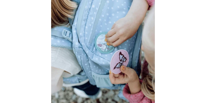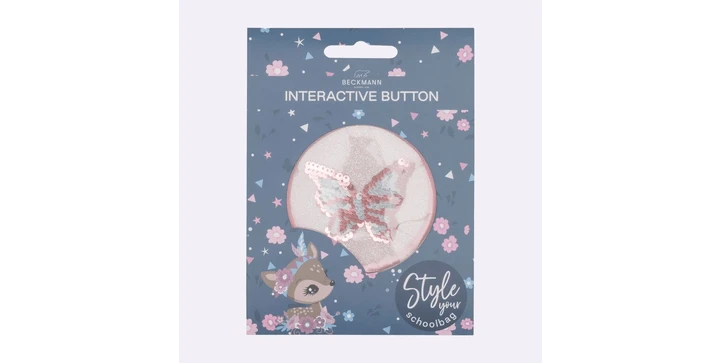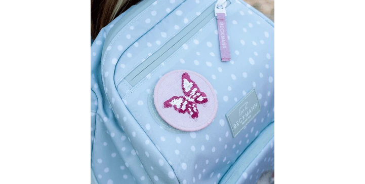 Der Schmetterlingsbutton mit lustigen Pailletten ist ein cooles Add on zum Aufpeppen des Schulrucksacks. Der Button wird ganz einfach mit Klettverschluss befestigt und ist somit kinderleicht austauschbar. So wird der Rucksack noch individueller!