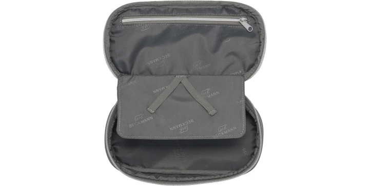 Das ovale Schlamperetui ist geräumig, hat ein separates Fach für die am häufigsten gebrauchten Stifte und eine Innentasche mit Reißverschluss.