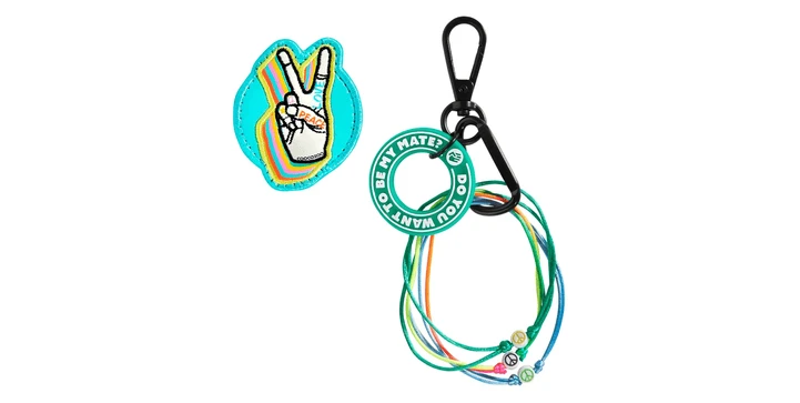 Zur Befestigung an den Klettflächen und Schlaufen der coocazoo Schulrucksäcke MATE, JOKER und PORTER Hochwertige coocazoo Qualität Klett-Patch mit Peace-Handzeichen in Regenbogen-Optik Anhänger mit Silikonring mit der Aufschrift „Do you want to be my Mate?“ sowie Freundschaftsbändern zum Teilen