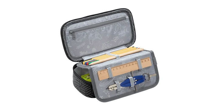 Alles andere als „schlampig“: Im Schulmäppchen geht so schnell nichts mehr verloren – Stifteorganizer und extra Fächer für Stundenplan, Geodreieck und Zirkel halten alles aufgeräumt an seinem Platz. In den Stiftschlaufen im Inneneinteiler sind die wichtigsten Stifte von Füller bis Bleistift sofort griffbereit. Im Stundenplanfach hat dein Kind direkten Überblick, was als nächstes kommt. Das große Hauptfach bietet genügend Platz für Spitzer, Schere, Klebestift und Lineale, kleinere Utensilien wie Tintenpatronen oder Kleingeld sind im Reißverschlussfach sicher aufgehoben. So ist dein Kind perfekt ausgestattet – ob für Schulaufsätze oder den Kunstunterricht.