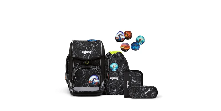 1.Schulranzen Kombiniert das Ergonomiekonzept innovativer Trekking-Rucksäcke mit all dem, was eine Schultasche leisten muss. Der cubo dreht die breite Form traditioneller Schulranzen um 90 Grad und schafft so extra viel Armbewegungsfreiheit. 2.Sportbeutel Kann wie ein Rucksack getragen werden. Mit extra Nass- bzw. Schuhfach. 3.Kletties Mit den 4 Kletties und einem zauberhaften Kontur-Klettie lässt sich der ergobag individuell gestalten. 4.Federmäppchen Bestens ausgestattet (22-tlg.), finden neben 17 Stiften in Reih und Glied auch Radiergummi, Lineal, Spitzer und Stundenplan ihren Platz. 5.Schlampermäppchen Praktisch für Stifte, Schere und all das, was im Schulalltag wichtig ist.