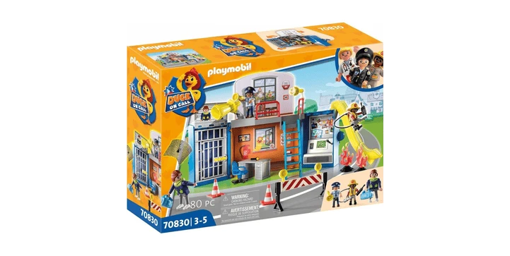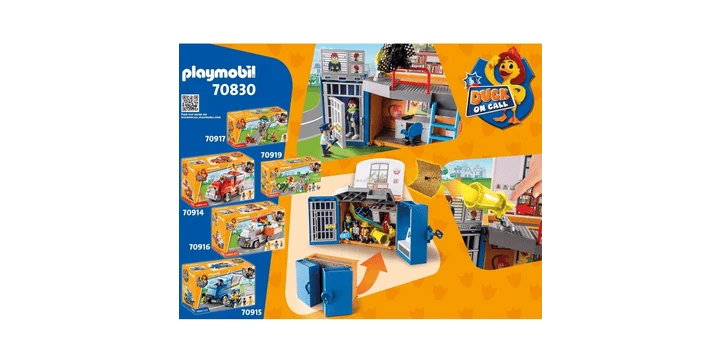 Mit der mobilen DUCK ON CALL Einsatzzentrale ist das Team immer und überall in Playmoville einsatzbereit. Über die Rutsche gelangen Polly und Freddy auf schnellstem Weg auch von der oberen Ebene zum Einsatz. In der Gefängniszelle sind alle Bösewichte sicher verwahrt. Und mit der integrierten Netzkanone lässt sich jeder Ganove fangen.Das Spielset besteht aus einem Koffer mit einer tragbaren Einsatzzentrale inklusive Gefängniszelle und Rutsche, sowie drei PLAYMOBIL-Figuren und ist ideal für unterwegs! Der gesamte Inhalt lässt sich nach dem Spielen schnell und einfach wieder verstauen.
