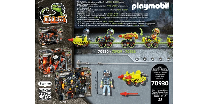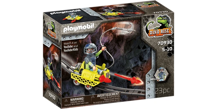 Auch Tüftler Milow hat sich an die neuen Gegebenheiten in der Dino Mine perfekt angepasst. Mit seinem Minen Cruiser kann er das Streckensystem der Dino Mine befahren. Gemeinsam mit seinen Kameraden von Team Dino Rise versucht Milow, den eingesperrten Dino aus den Fängen der Miners zu befreien. Das Set enthält Milow vom Team Dino Rise in kompletter Rüstung, einen Minen Cruiser mit Schussfunktion und drei Geschossen und weitere tolle Extras. Der Minen Cruiser kann mit den Schienenfahrzeugen aus den anderen Dino Rise Sets (70925 und 70929) kombiniert werden.
