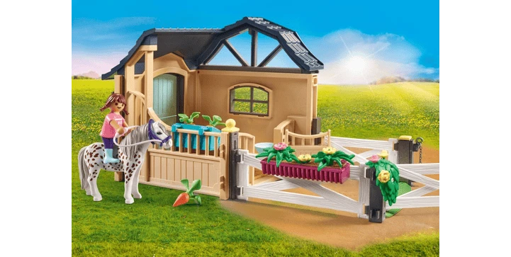 - Zubehör: 1 Reitstallerweiterung, 1 Futterraufe, 1 Stroheinlage, 1 Tränke, 1 Blumenkasten, 3 Grünpflanzen, 1 Rankpflanze, 1 Zügel, 1 Halfter, 3 Karotten