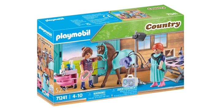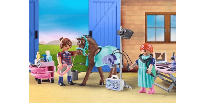 Unterstütze die Tierärztin bei der Versorgung der Pferde mit dem PLAYMOBIL-Set Tierärztin für Pferde. Mithilfe des mobilen Röntgengerätes macht die Ärztin Aufnahmen des verletzten Pferdefußes. Anschließend betrachtet sie die Bilder genau auf dem Laptop. Zum Verarzten des Tieres liegen dem Set Verbandsetiketten bei. Weitere Tierarztutensilien werden im praktischen Beistellschrank mit Rollen aufbewahrt. Ein liebevoll gestaltetes Spielset, ideal für Kinder, die selbst einmal Tierärztin oder Tierarzt sein möchten.
