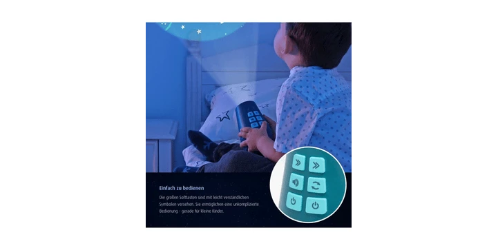 Das Nachtlicht ist mit großen Softtasten ausgestattet. Diese sind mit leicht verständlichen Symbolen versehen und sorgen so für eine intuitive Handhabung. Dadurch lässt es sich insbesondere für Kinder leicht bedienen. Durch einfaches Drücken der verschiedenen Tasten können sie selbstständig die Licht- und Musikfunktion ein- oder ausschalten, die gewünschten Motive auswählen oder die Lautstärke anpassen.