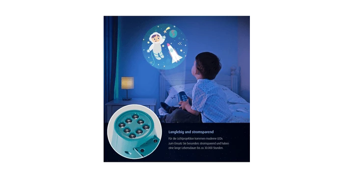 Für die Lichtprojektion kommen kleine LED-Lämpchen zum Einsatz. Dadurch vereint der Projektor alle Vorteile einer modernen LED-Lichtquelle. Zum einen ist er besonders stromsparend und hat eine lange Lebensdauer (bis zu 30.000 Stunden). Zum anderen sorgt er für eine besonders sichere Anwendung, weil LED-Leuchtmittel nicht warm werden.
