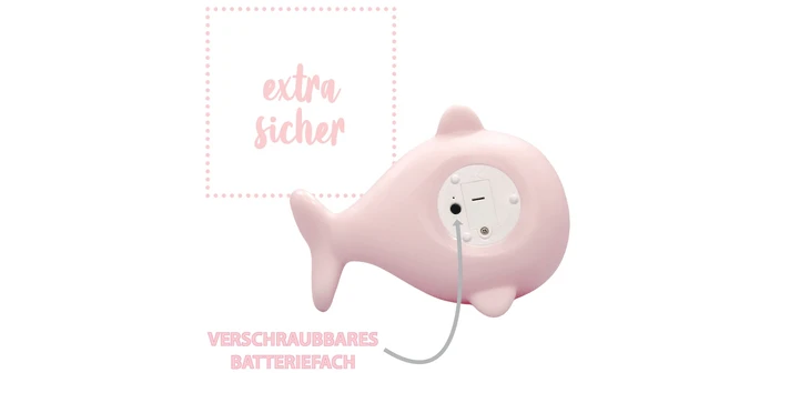 Die SeaLife-Tiere sind batteriebetrieben. Für eine extra Portion Sicherheit ist das Batteriefach mit einer Schraube vor dem kindlichen Forschungsdrang gesichert. So gelangt Dein Kind nicht an die Batterie, es besteht keine Gefahr des Verschluckens. Zudem machen das kantenfreie Design sowie das schadstofffreie Material – frei von BPA und Phthalaten – das Nachtlicht für unsere Kleinsten zu einem sicheren Begleiter.