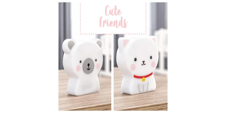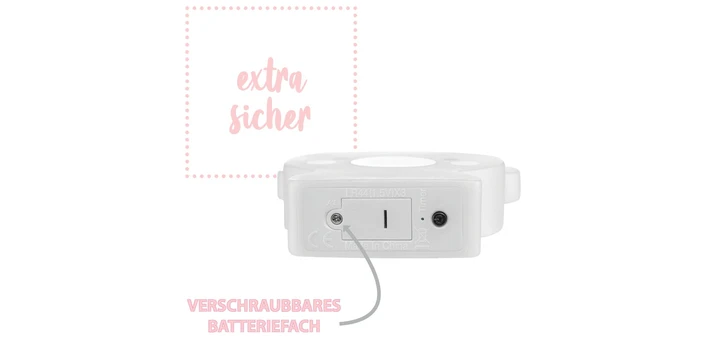 Die CuteFriends sind batteriebetrieben. Für eine extra Portion Sicherheit ist das Batteriefach mit einer Schraube vor dem kindlichen Forschungsdrang gesichert. So gelangt Dein Kind nicht an die Batterie, es besteht keine Gefahr des Verschluckens. Zudem machen das kantenfreie Design sowie das schadstofffreie Material – frei von BPA und Phthalaten – das Nachtlicht für unsere Kleinsten zu einem sicheren Begleiter.