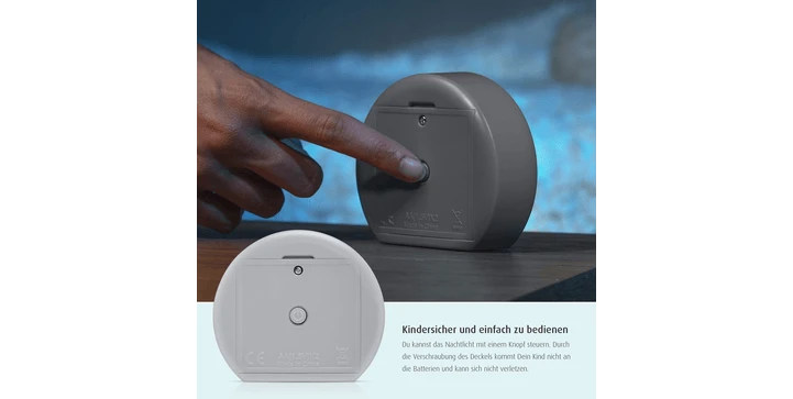 Das batterie-betriebene Nachtlicht ist unabhängig von Steckdosen überall flexibel einsetzbar. Das Batteriefach ist dabei zu jeder Zeit mit einer Schraube vor dem Forschungsdrang und der kindlichen Neugierde geschützt.