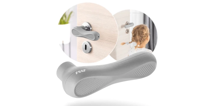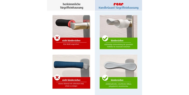 Im Gegensatz zu anderen Griffabdeckungen, welche lediglich den vorderen Teil der Türklinke absichern, ummantelt der reer HandleGuard den kompletten Türdrücker und sichert so auch die Klinken-Ecke.