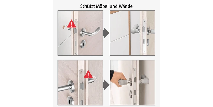 Unser Türgriffschutz verhindert Verletzungen Deines Kindes und schützt gleichzeitig nach einem schwungvollen Öffnen auch die dahinter befindlichen Wände oder Möbel vor Beschädigungen.