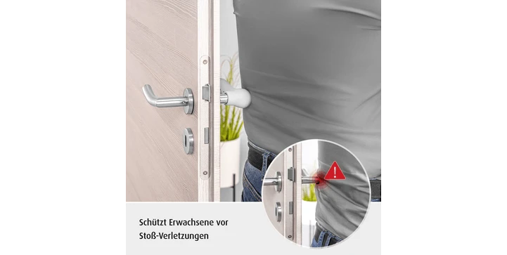 Die Griff-Ummantelung dämpft schmerzhafte Stöße an Türklinken zuverlässig ab. Dabei schützt sie nicht nur Kinder vor Kopfverletzungen, sondern verhindert auch Stoßverletzungen im Rumpf- oder Armbereich von Erwachsenen. Zudem sorgt sie dafür, dass Wände, Möbel oder andere Gegenstände durch unbeabsichtigtes Türaufschlagen nicht in Mitleidenschaft gezogen werden und hässliche Macken entstehen.