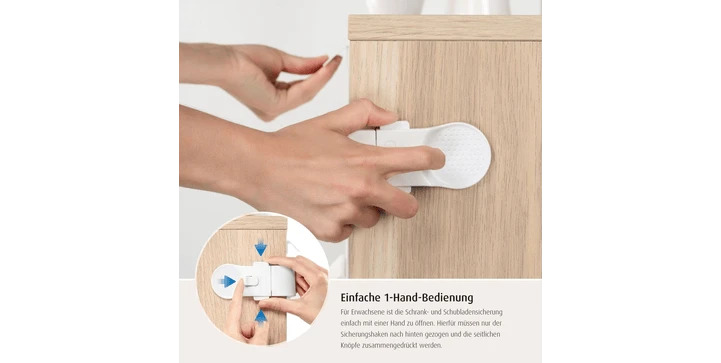 Dank der 3fach Verriegelung der Schrank- und Schubladensicherung sind deine Möbel sicher vor kleinen Entdeckern verschlossen. Für Erwachsene ist es dennoch ein Leichtes diese mit nur einer Hand zu öffnen. Hierfür drückst Du einfach die 3 Druckknöpfe gleichzeitig und öffnest gleichzeitig wie gewohnt Deine Schublade.