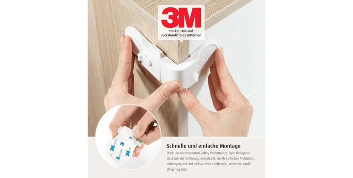 Die Multisicherung Schrank- und Schubladensicherung lässt sich dank dem mitgeliefertenvormontierten, speziell entwickelten reer Safety Performance Tape schnell und unkompliziert anbringen. Das Klebeband gewährleistet sorgt für festen Halt der Sicherung einen festen Halt und ein rückstandsfreies Entfernen bei NichtgebrauchEntfernen, wenn Dein Kind alt genug ist und Du die Kindersicherung nicht mehr benötigst.
