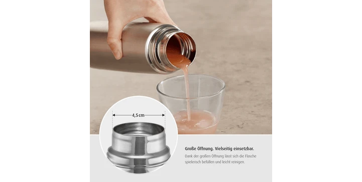 Die 4,5 cm breite Trinköffnung sorgt für ein einfaches Befüllen der Flasche. Dank der extra großen Öffnung können selbst frisches Gemüse oder geschnittenes Obst eingefüllt werden – für ein fruchtiges Sommergetränk.
