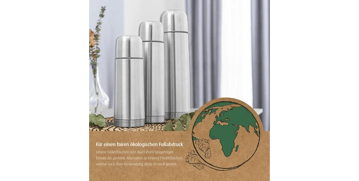 Unsere Isolierflasche leistet einen Beitrag zum Umweltschutz. Durch ihre robuste Verarbeitung lässt sie sich viele Jahre lang einsetzen. Sie sind die perfekte Alternative zu Einweg-Flaschen, welche nach ihrer Nutzung direkt im Müll landen. Für möglichst wenig Verpackungsmüll werden die Flaschen unverpackt verkauft und sind lediglich mit Produktanhängern versehen, welche aus 100% recycelbaren Kraftpapier hergestellt werden. Zum Schutze unserer Erde und somit auch der Zukunft unserer Kinder.
