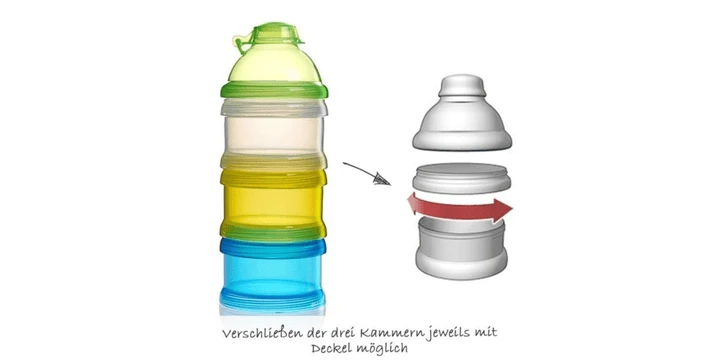 Bekanntlich muss das Milchpulver für Babys stets in der vom Hersteller angegebenen Menge mit Wasser angerührt werden. Bevor das Kind dann seine Flache erhält, muss das Milchpulver abgemessen werden, allerdings ist hierfür nicht immer Zeit. Denn wenn das Baby Hunger hat, zählt jede Sekunde. Der Milchpulver-Portionierer – bestehend aus 3 Dosen und einem Deckel mit Fülltrichter – hilft, die richtige Pulvermenge, jeweils auf eine Portion abgestimmt, vorzubereiten und so die Milchnahrung für das Kleine schnell und sicher zubereiten zu können.