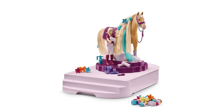 Die Beauty-Behandlung in der Pferdepflege Station darf gern länger dauern! Das Beauty-Horse genießt die Streicheleinheiten mit den verschiedenen Bürsten und dem Schwamm. Damit Mähne und Schweif schneller trocknen, liegt der Fön in der Schublade bereit. Und schon kann das Styling losgehen. Ins Haar kommen Perlen, Schleifen oder Blumen und auch eine zusätzliche Haarsträhne liegt bereit. Damit Pferd und Reiter aller Welt zeigen können, dass sie zusammengehören, gehen sie im Partnerlook: Pferdedecke und Weste haben das gleiche Muster und auch die Gamaschen passen zum Armband..