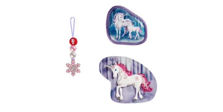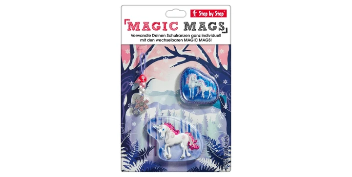 Ein Set enthält zwei MAGIC MAGS-Motive und zusätzlich einen Anhänger, der sich an einer Aufhängeöse am Schulranzen oder Rucksack befestigen lässt.