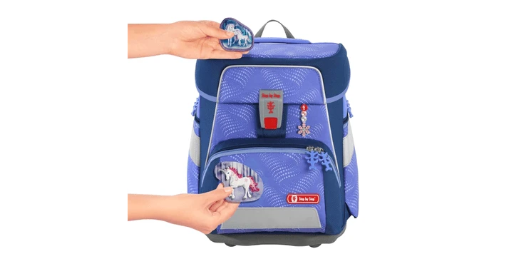 Die MAGIC MAGS lassen sich jederzeit austauschen. Sie halten einfach an den integrierten Magnetflächen des Step by Step Ranzens oder Rucksacks– so gefällt er bis zur 4. Klasse.